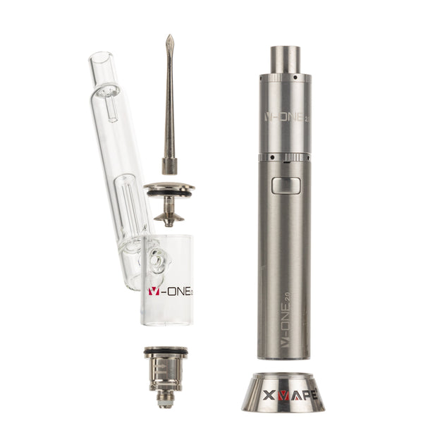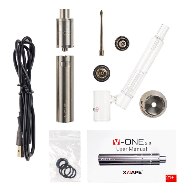 The XVAPE Vaporizer V-ONE 2.0 is a 1500mAh, portable wax vaporizer with two mouthpieces and two temperature settings. The kit comes with the V-ONE 2.0 battery and stainless steel mouthpiece, user manual, a micro USB charging cable, a spare 0.5ohm dual quartz coil, replacement rings and a battery stand. The kit also includes a micro glass bubbler kit which includes the glass bubbler mouthpiece and a magnetic dab tool with carb cap.
