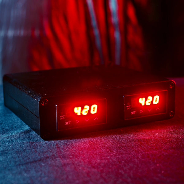 Introducing the new Dual Coil PID Controller from Crossing, compatible with the full range of SZ Crossing coils! This is a regular PID controller with a live temperature display and screen on the front. The controller also allows the temperature to be adjusted in one Fahrenheit increments giving you full control of the temperature. It has two separate coil plugs on the back, each with their own power switch and temperature control screen on the front, allowing you to run two different setups with different temperatures at the same time!