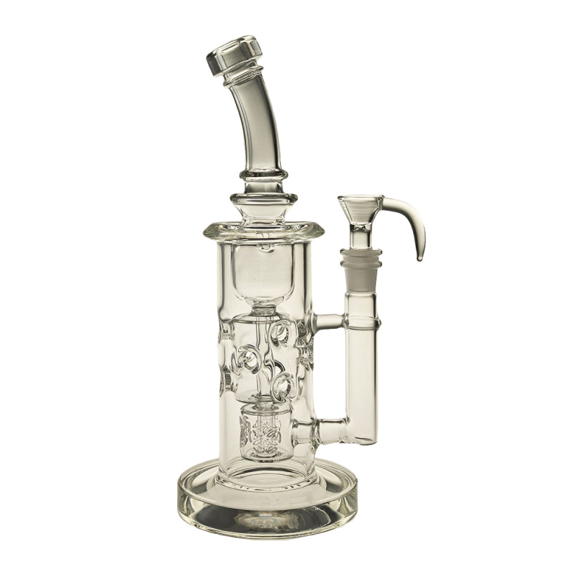 Adopting the technology of Torus and Straight Fab, this percolator bong is made from high-quality and clear glass and is also just the right size for travel. Featured with a height of 9-10 inches,. The thick base is so stable with a spacious room that the worry of slipping down the instruments is unnecessary. Meanwhile, the design of the bent neck flared mouthpiece makes it much easier for users to enjoy the process of smoking. If you are desired to experience more bubbles and smooth hitting, the flower of the life percolator deserves a try.