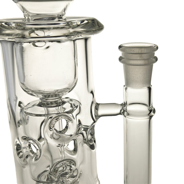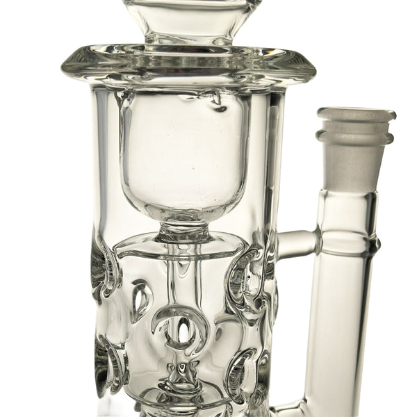 The Swiss Perc gets its name from Swiss Cheese. The lacy holes go straight through the bong. If you look closely, you can see a smaller glass “can” welded on the inside. Each hole is a weld between the outer and inner glasses.This dramatically reduces the internal volume of the bong itself, which maximizes flavor and minimizes flavor loss.It also affects the water bubbles! The welded holes create a multi-channeled path for smoke or vapor to travel. This makes the bubbles last longer – an effect often referred to as “stacking”.The Swiss Perc extends the bubblestack without adding any additional percolation or flavor loss.