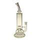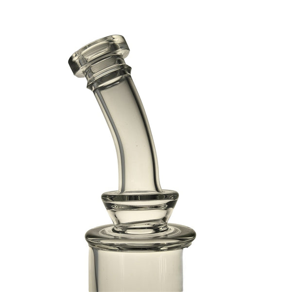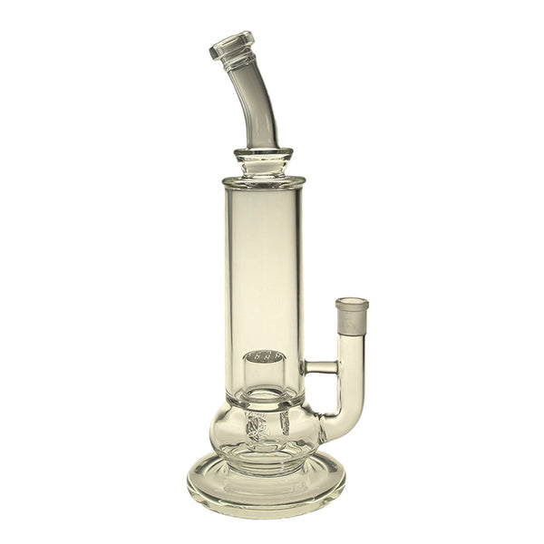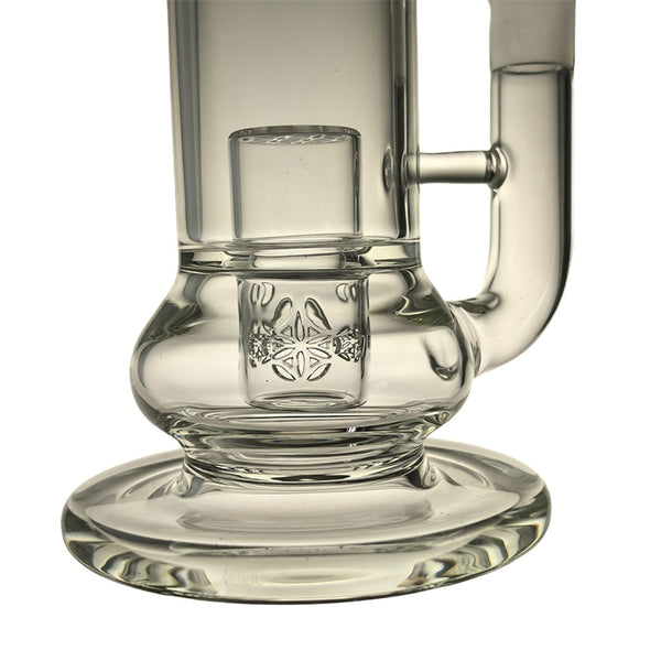 Crafted from sturdy 5mm-thick glass, this piece features a simple cylindrical design sitting atop a wide base, with a bent mouthpiece on the top. The body of the pipe has two chambers within it, both holding an intricate seed of life percolator. These are amazing percolators for getting the best filtration possible, because they have tons of holes for smoke to percolate through for impressively smooth hits. The narrow-chambered design along with the curved mouthpiece create an ergonomic design for easy handheld smoking, with a wide base for great stability on surfaces.