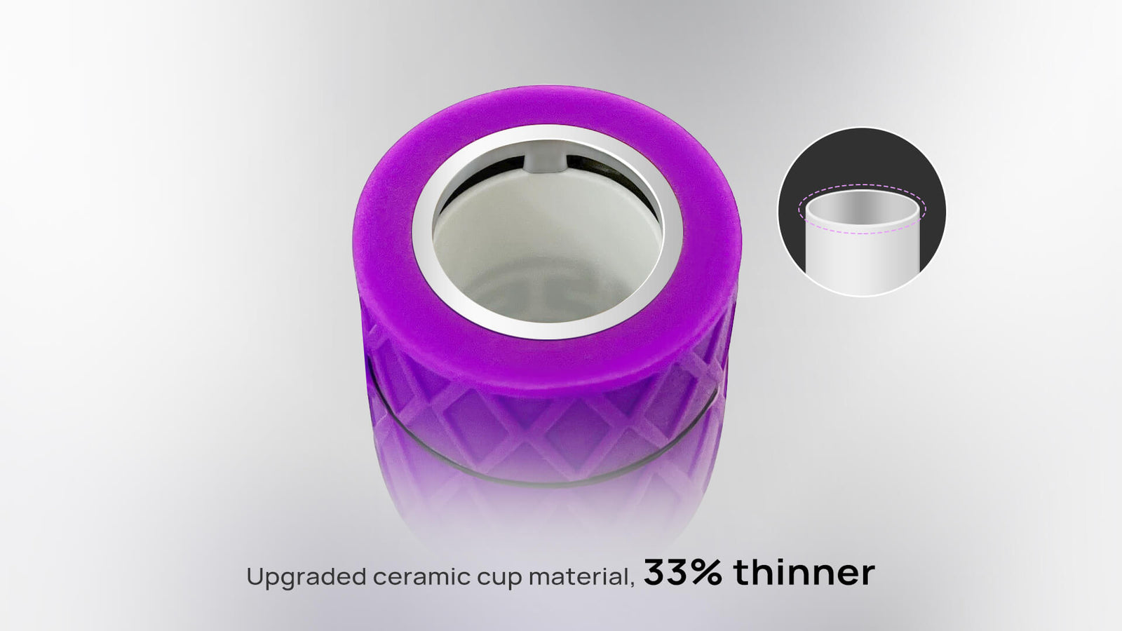 Upgraded ceramic material is thinner yet sturdier, more durable, and easier to clean. It cuts heat-up time by 10 seconds on average, enabling quicker, more consistent sessions. 360° sidewall heating ensures even heating and eliminates burnt residue, providing a seamless dabbing experience.